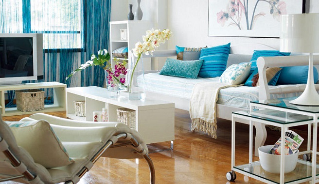 Por ejemplo, las paredes y los sofás pueden lucir una tonalidad clara; y los cojines, lámparas, cuadros o alfombras que estos tengan, un color turquesa o mostaza.